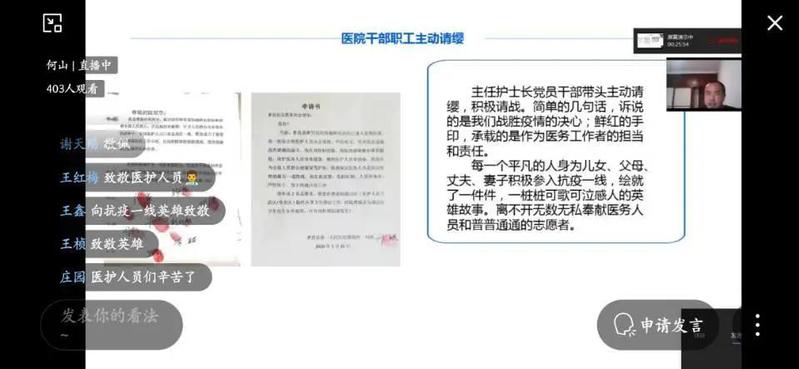 何子强以“回顾抗疫一线,厚植家国情怀”为题,从疫情期间我们经历了什么;我是医生,更是战士;我们为什么必定胜利等三个方面回顾分享了抗疫经历。用真实生动的事例和切身感悟,展示了医务工作者舍小家、顾全局与病魔较量的伟岸,展示了“一方有难,八方支援”的民族情结,更展示了党组织坚强有力的保障和强大有力的中国之制。