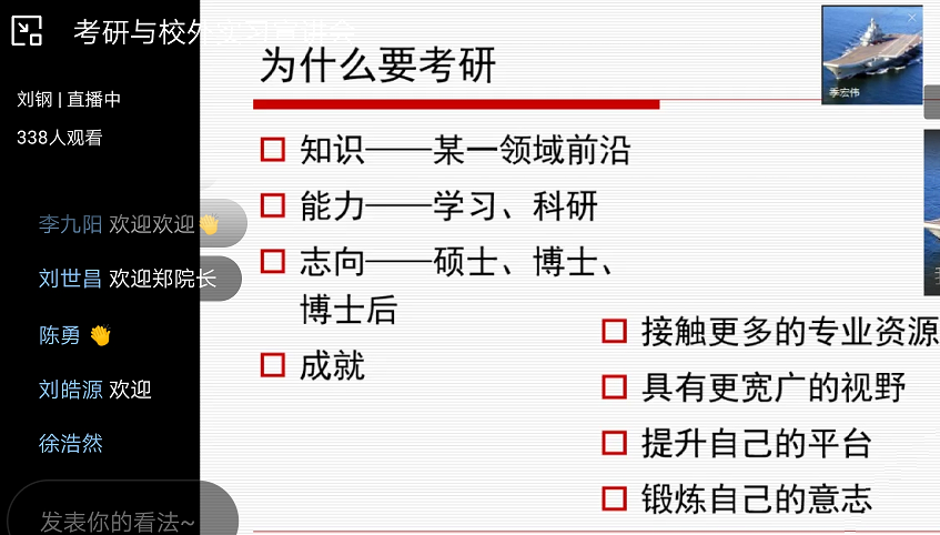 召开了2017级学生考研、校外就业实训网络宣讲会。本次会议利用企业微信平台进行直播,旨在为即将面临考研和就业的2017级学生进行指导,并做好相关政策的讲解。日本做爱