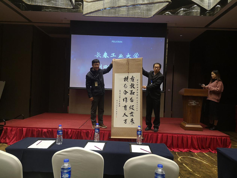 赠给和硕公司一幅字画,希望在校企双方共同努力之下,拓宽校企合作领域、创新校企合作方式,让校企合作之花结出更加丰硕的果实。