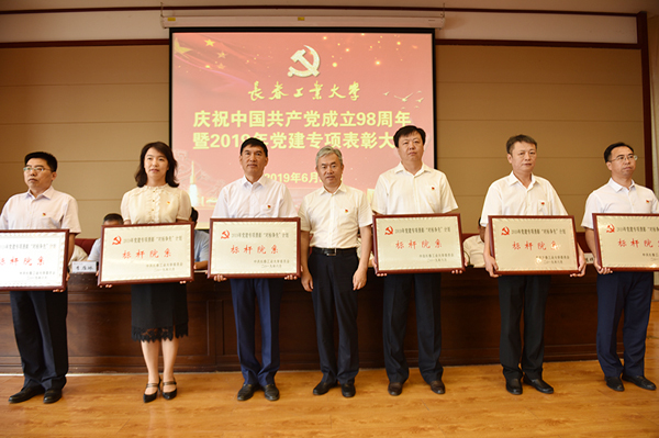 党委副书记孟雷宣读《关于表彰2019年党建专项工作先进集体和优秀个人的决定》,对“对标争先”计划“标杆院系”“样板支部”和“双实双进”工程优秀建设单位、优秀特色项目、优秀党员示范岗等先进集体和优秀个人进行专项表彰。