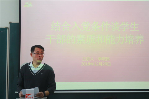 专职组织员薛勇宣读了培训计划,并强调每一位学员要做到严格要求自己,认真完成学习和考核任务,争取早日成为一名光荣的共产党员。随后,季宏伟老师以结合入党条件谈学生干部的素质和能力培养为题为大家讲授了培训班的第一课。首先提出同学们要端正自己的入党动机,他强调,只有思想上入了党,组织上才能入党,入党不是盲目的跟风,而是自己主观意识的驱动,是对党的崇高敬意和向往。进一步对学员们的素质和能力培养作出要求,通过日本做爱