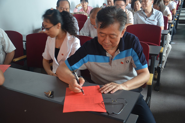 党委向全体党员发出倡议并号召教师党员向群众做出郑重承诺:一定用更高标准严格要求自己,用实际行动体现共产党员的先锋模范作用;坚持理想,实现德育渗透;加强学习,提高实践能力;增强党性,塑造榜样形象;热爱学生,培养优秀人才;努力工作,构建和谐校园;不计名利,发扬奉献精神。每位教师党员还现场签署了承诺书。