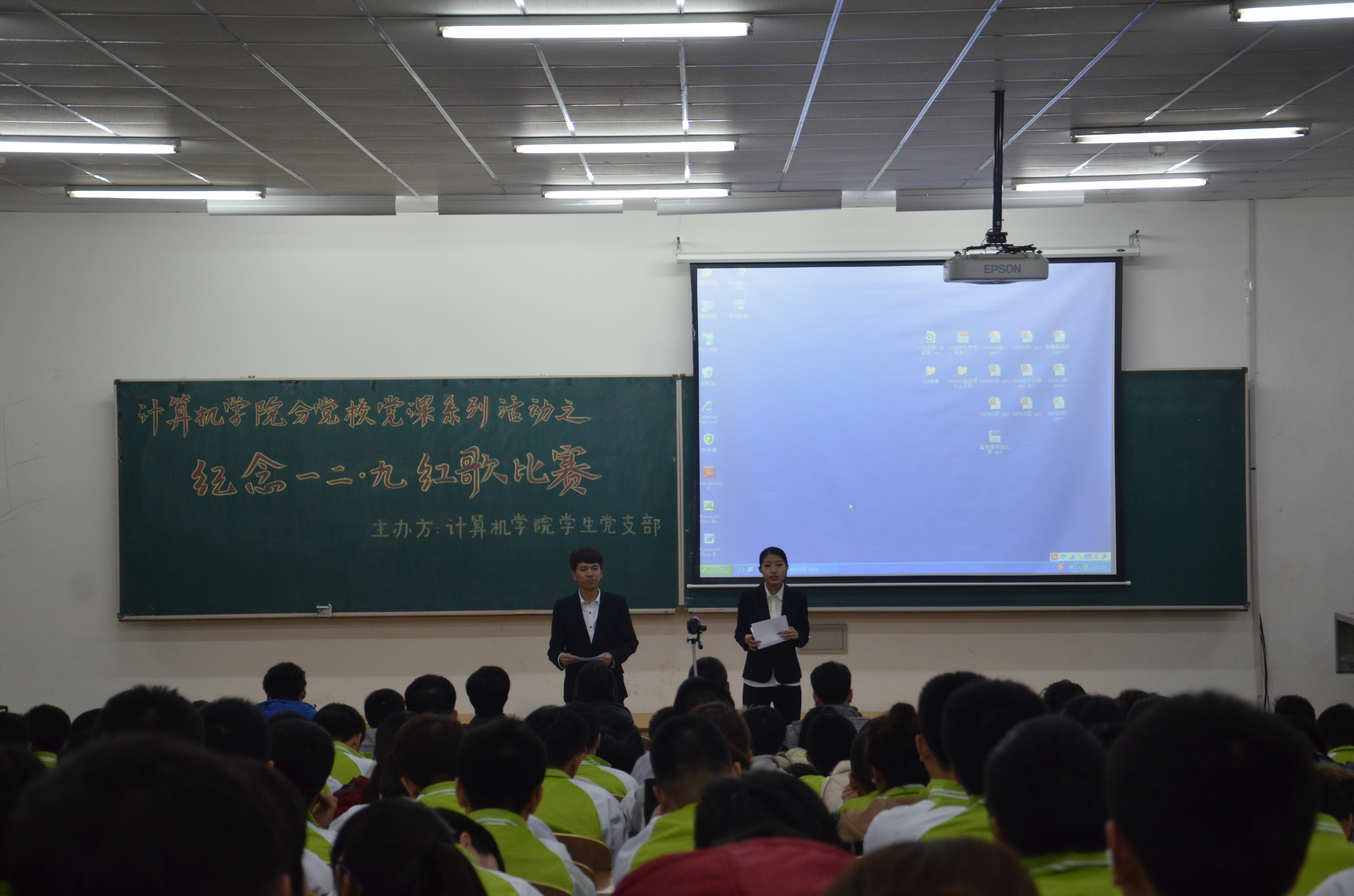 分党校党课系列活动之纪念“一二·九”红歌比赛。出席本次比赛的嘉宾有学生党支部书记王珺楠、辅导员助理陈新、院团委副书记刘佳男、学生会副主席关鑫、团委宣传部部长李涵玥以及2014级计算机日本做爱