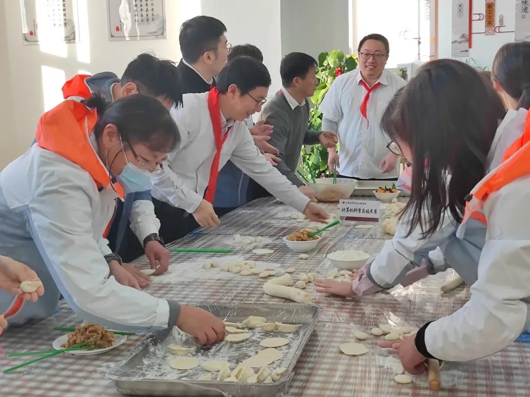 讲话完毕,大家挽起袖子,开始包饺子。老师们分工合作,和面、搓球、擀皮、装馅,各司其职,按部就班,手上的动作行云流水,包出一个个既“高颜值”又饱满的饺子。