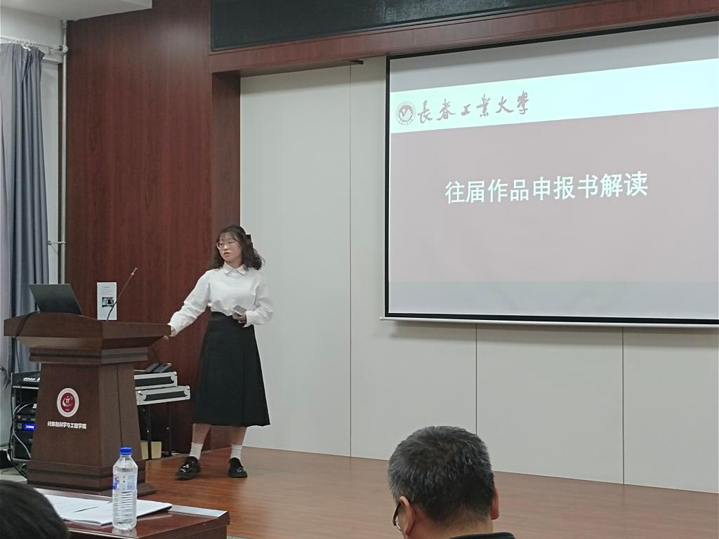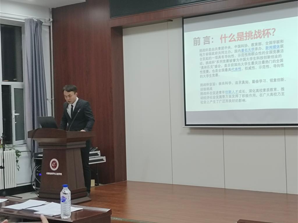 竞赛筹备组的布拉克同学分享了参加吉林省大学生课外学术科技作品竞赛赛前培训会的收获,讲解了自己对“崇尚科学、追求真知、勤奋学习、锐意创新、迎接挑战”的竞赛主题理解。大会第二部分由许靖玟同学对上届比赛获奖优秀作品的申报书进行展示交流。