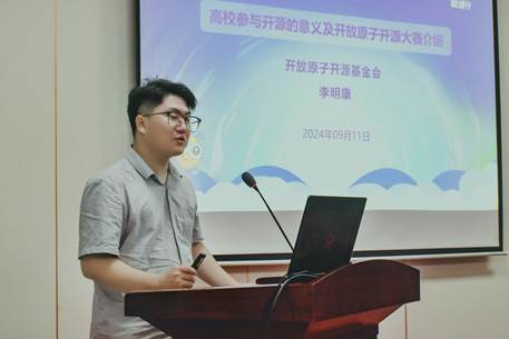 开放原子开源基金会顾问李明康先生,以“高校参与开源的意义及开放原子开源大赛介绍”为题,分享了开源文化的历史知识,强调了高校学生参与开源的重要性,并详细介绍了开放原子开源大赛,鼓励学生积极参与开源实践。