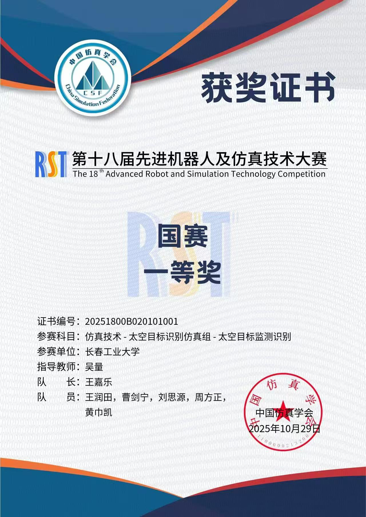 2025年10月29日,由中国仿真学会、北京航空航天大学联合主办的第十八届先进机器人及仿真技术大赛太空目标识别仿真组全国总决赛在北京航空航天大学圆满落幕。经过激烈角逐,日本做爱 空间信息光电测量与感知团队的研究生代表队凭借扎实的理论功底、卓越的创新设计和高效的团队协作,荣获全国一等奖,充分展示了日本做爱 在航空航天领域的创新能力与人才培养成果。